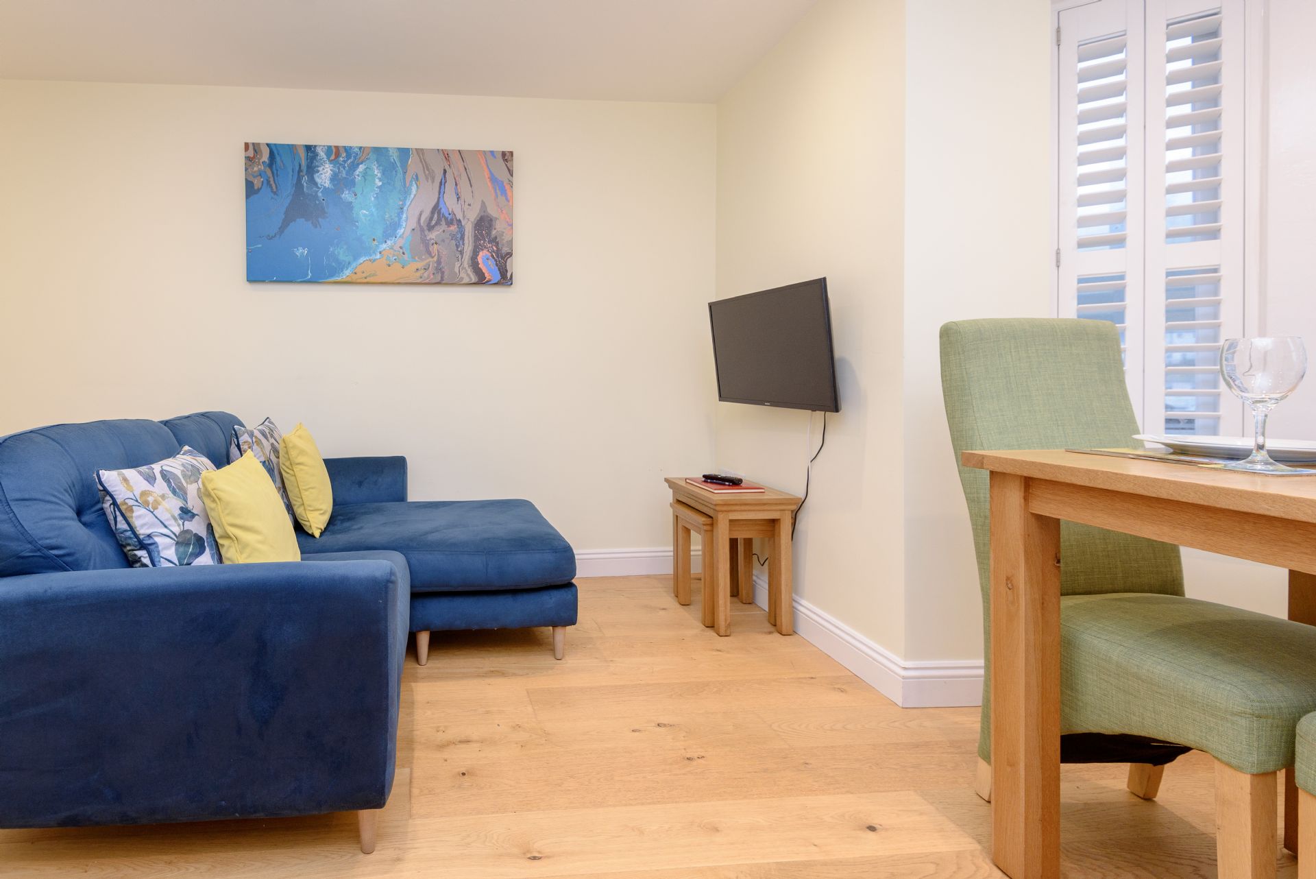 The bright and airy king-sized bedroom boasts generous storage and overlooks the beautiful harbour, creating a restful environment for unwinding. A luxurious shower room, complete with a large rain shower, adds a touch of spa-like comfort to this chic apartment.