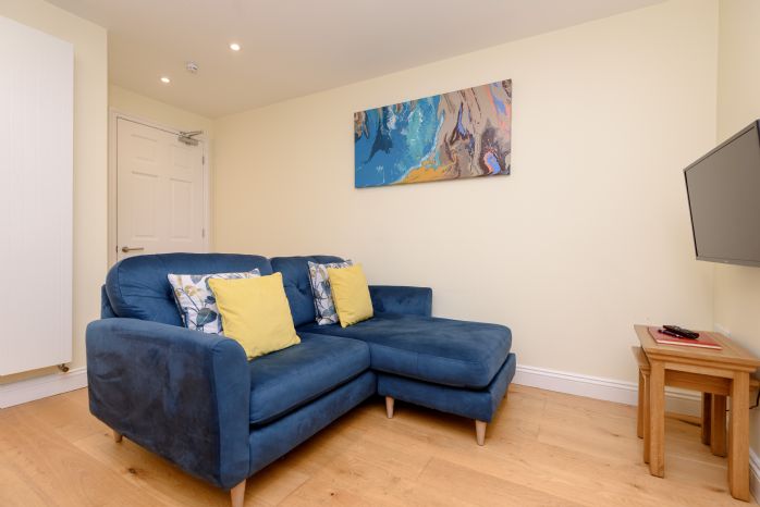 The apartment’s open-plan lounge, kitchen, and dining area are tastefully equipped with granite worktops and high-quality appliances, including an electric oven, hob, microwave, fridge-freezer, and dishwasher. The dining area overlooks the rooftops to Looe Harbour, providing a picturesque setting for meals, while the lounge area features a 32" Smart TV, comfortable seating, and free Wi-Fi to ensure relaxation after a day’s adventure.
