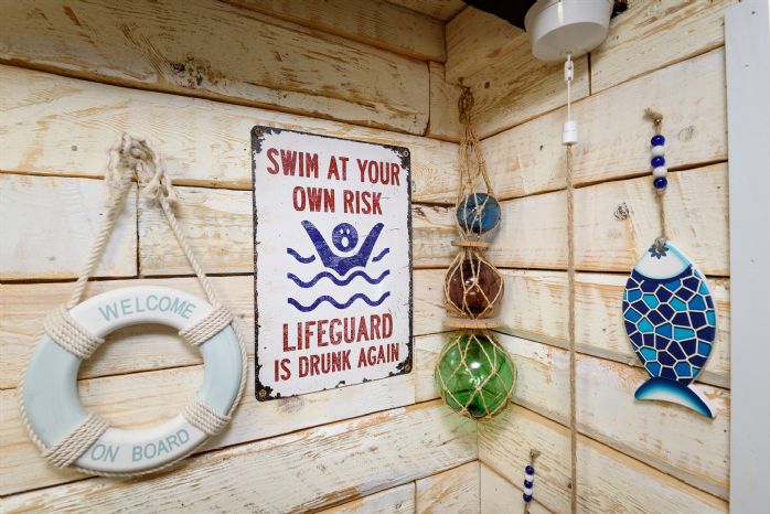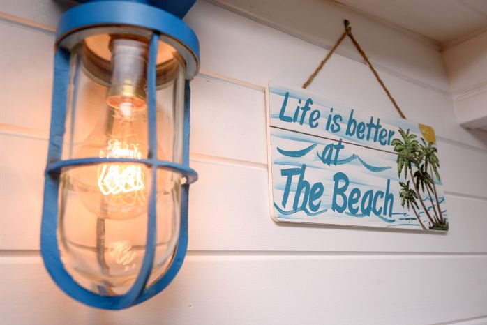 Step inside to discover a cosy open-plan living space with a delightful nautical theme. Decorative portholes, maritime accents, and a ship-inspired interior give Galleon a unique personality. The compact living area includes comfortable seating, a Smart TV, Wi-Fi, and electric heating – ideal for relaxing after a day by the sea. A collapsible dining table with stools provides space for mealtimes, and the kitchen includes an electric fan oven, induction hob, fridge with freezer box, kettle, toaster, slow cooker, air fryer and other essentials, making it easy to self-cater during your stay.