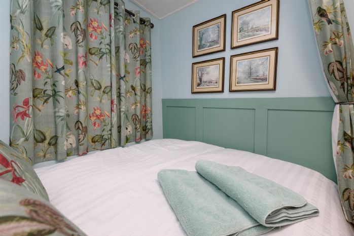 The main bedroom is a snug double, featuring a stylish lightbox picture feature for added ambience (please note it is not possible to walk down one side of the bed). The second bedroom is a bunk room, designed specifically for children aged 6 and above, making this property ideal for couples or small families. A shower room completes the layout, with a mixer shower, wash basin, and WC.