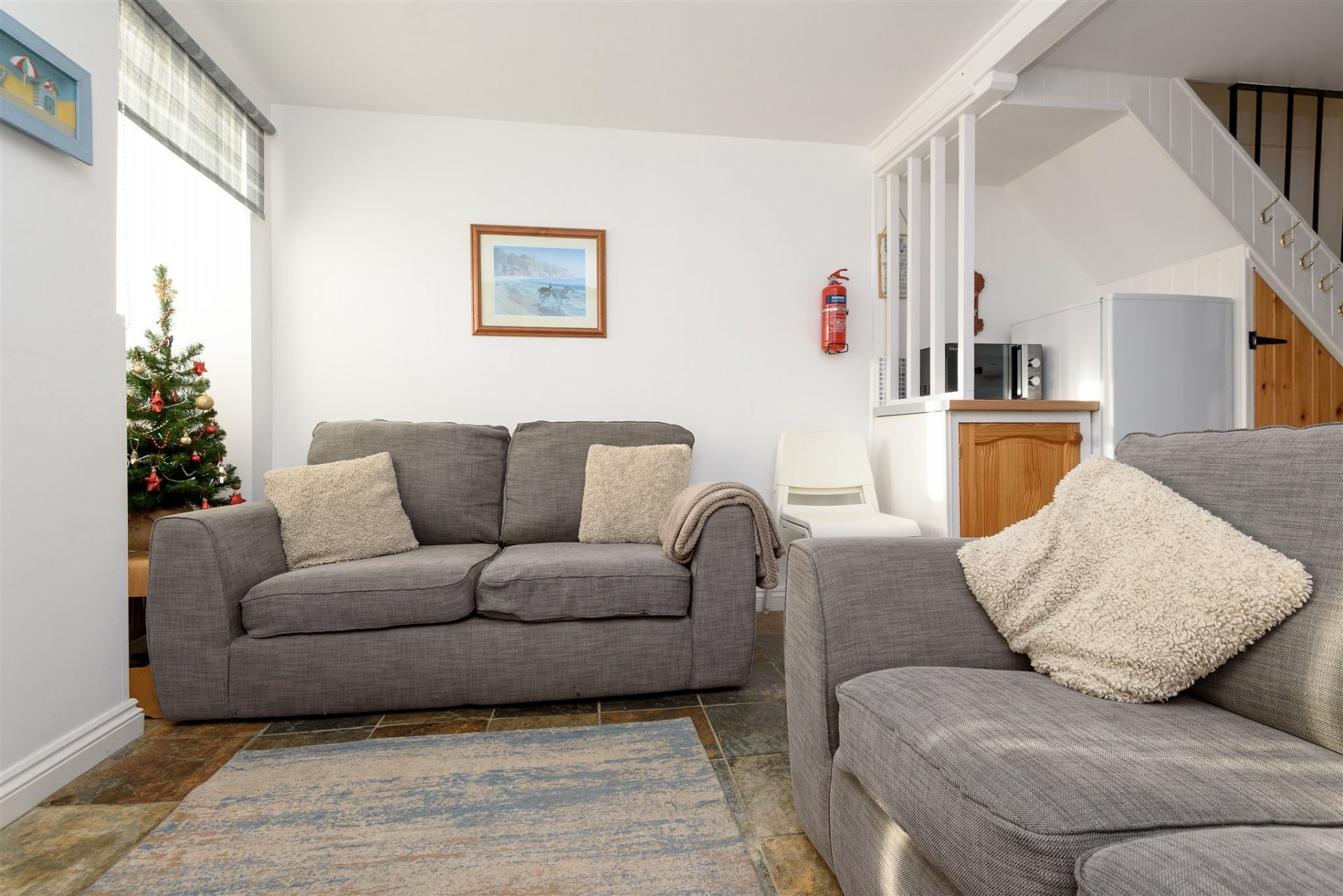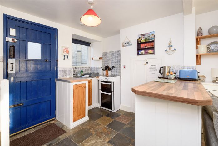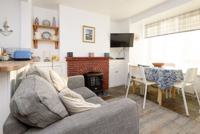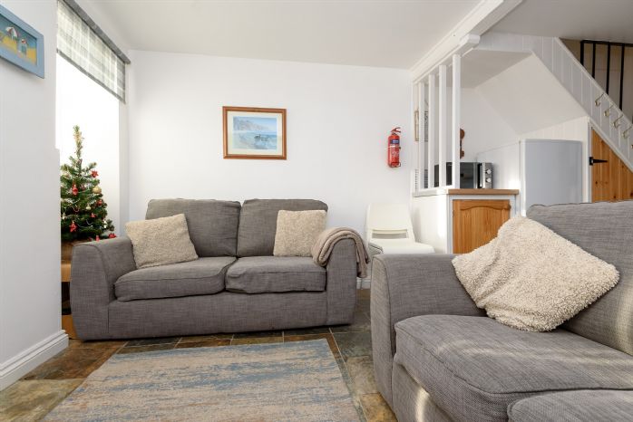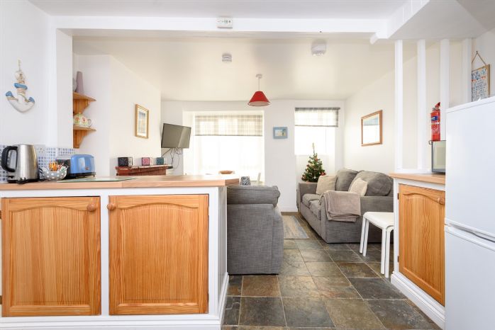 On entering the property there is a bright lounge, kitchen, diner with slate tiled floor. The kitchen area is small but well equipped and has electric oven and hob, fridge/freezer, microwave, toaster and kettle, there is a washing machine housed upstairs. The lounge area has two sofas a 32" Smart TV and DVD player and there is a dining table which seats four or extends to seat six. The property also has free wifi.