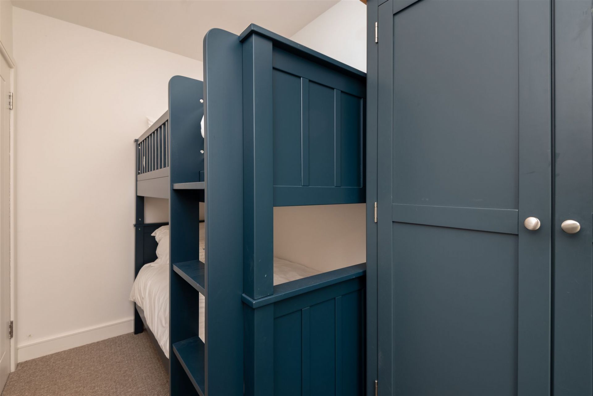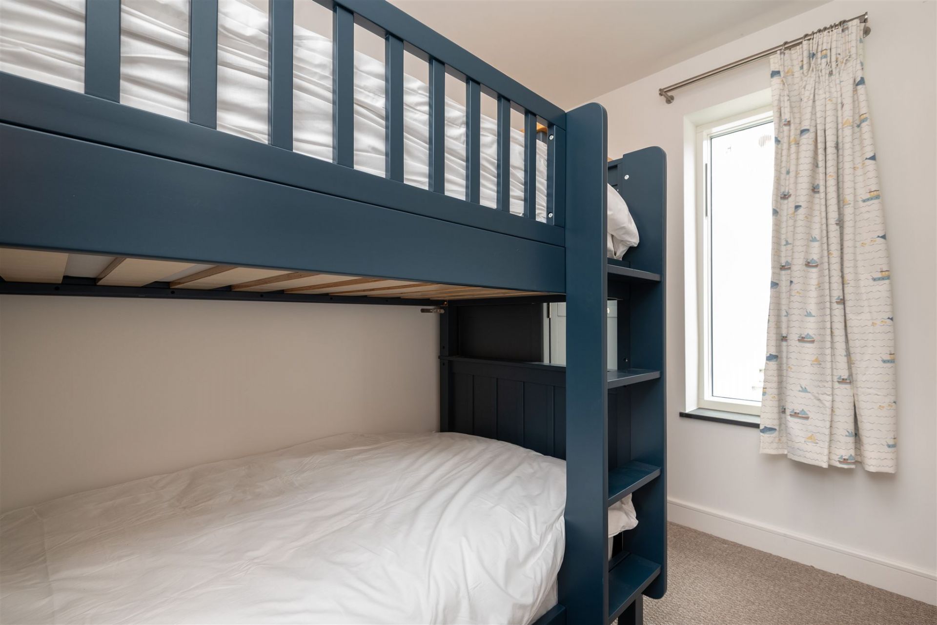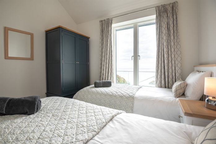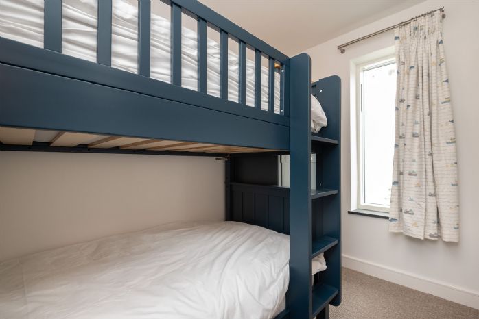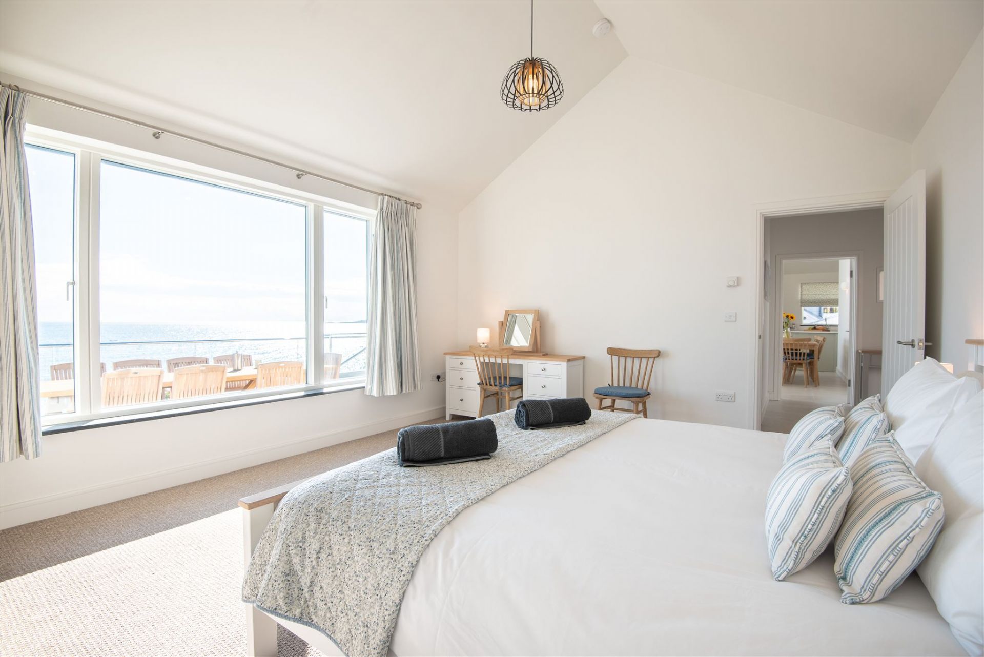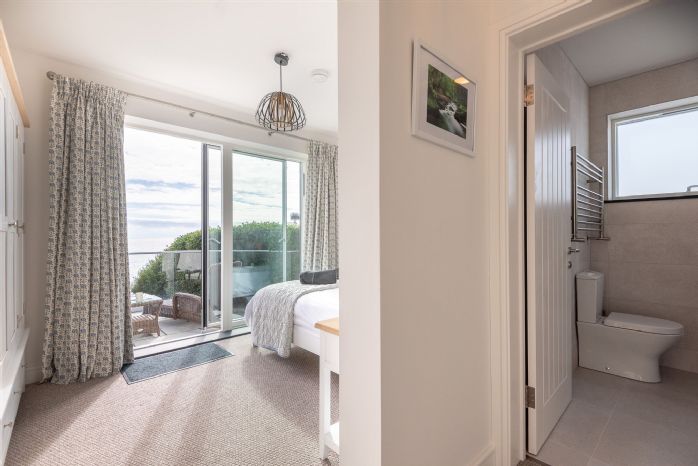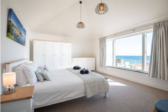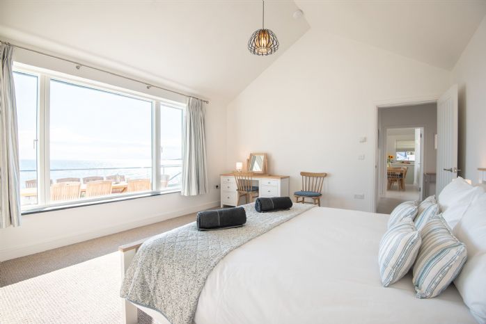 Step inside to a bright and welcoming hallway, tiled for a cool, coastal feel. To the front of the house, the beautifully appointed master bedroom features a super king-size bed, vaulted ceiling, and a large picture window framing breathtaking sea views — a peaceful spot to wake to the sound of the waves. Also accessed from the entrance hallway are a twin bedroom, with the same fabulous sea views, a charming bunk room with solid wooden bunks, a sleek family bathroom with both bath and walk-in shower, and a separate cloakroom, ensure practicality and comfort for guests. The fourth bedroom lies to the far side of the living area and is a king bedroom, complete with an ensuite shower room and French doors that open directly onto the patio — an idyllic spot for morning coffee as the sun rises over the sea.