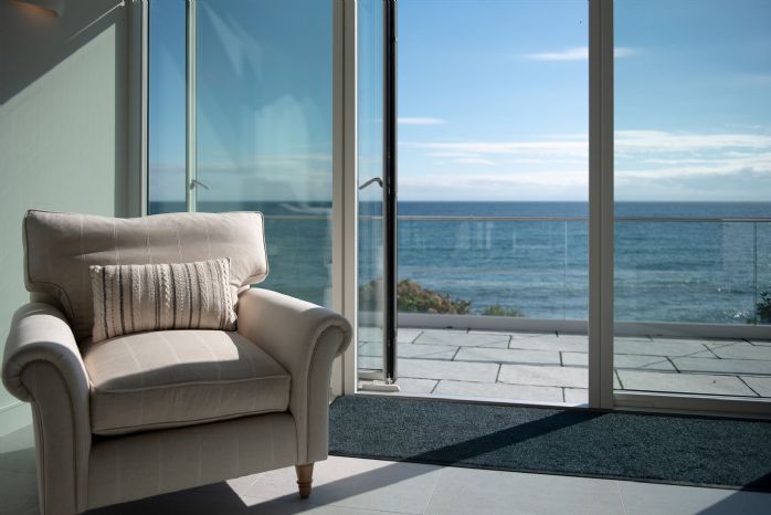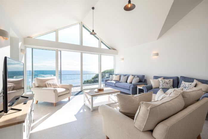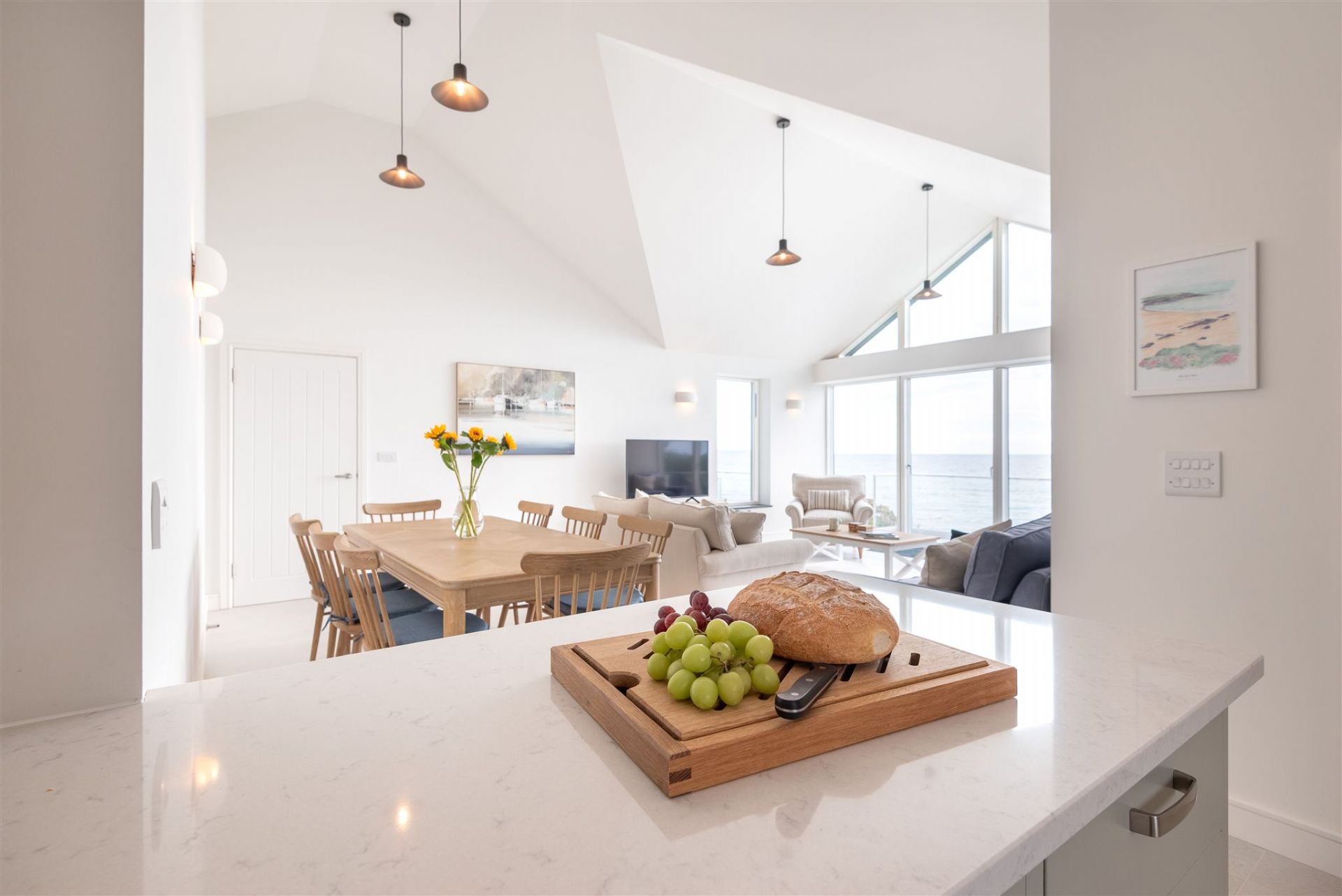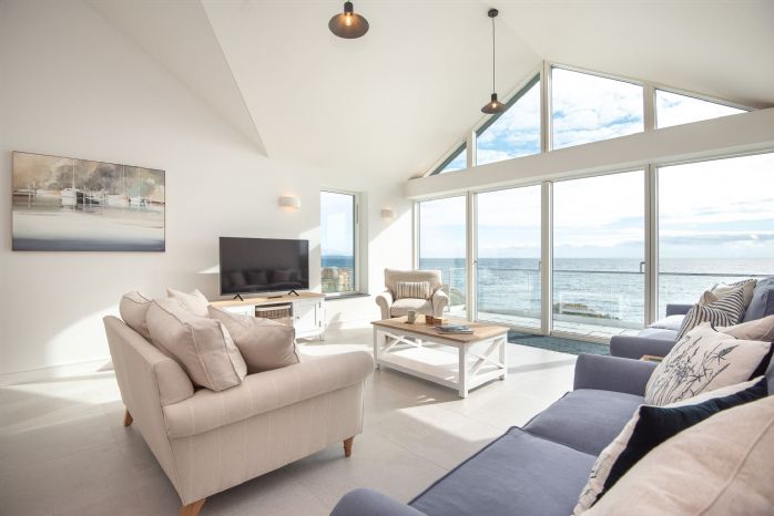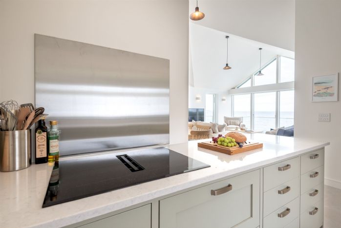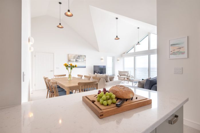 At the heart of the home lies the showstopping open-plan living, dining, and kitchen area — a space designed to draw the outside in. Floor-to-ceiling glass at the gable end floods the room with natural light and captures the mesmerising coastal panorama beyond. Two plush three-seater sofas and an armchair are perfectly positioned to make the most of the views, while a large dining table for eight invites relaxed family gatherings.