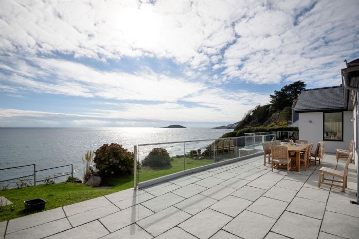 Outside, a spacious slate-tiled terrace with glass balustrade ensures uninterrupted views of the sparkling water. Furnished with a large dining table, chairs, and loungers, this area is perfect for al fresco dining or simply watching the tide roll in. Steps lead down to the large, grassed garden where there’s an outdoor shower, ideal for rinsing off sandy toes after a day on the beach, and from here, private steps lead directly to the shore — a truly special feature.